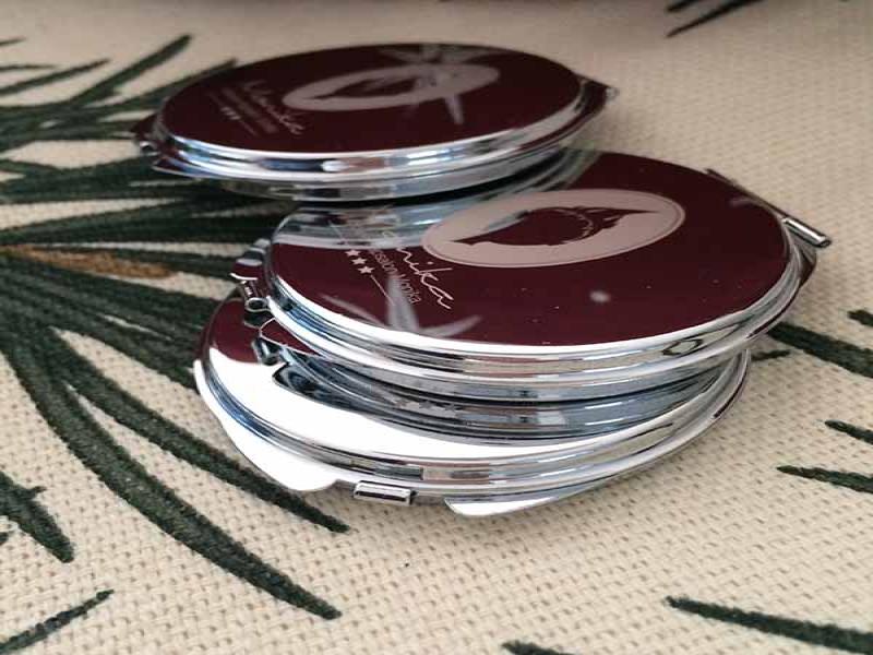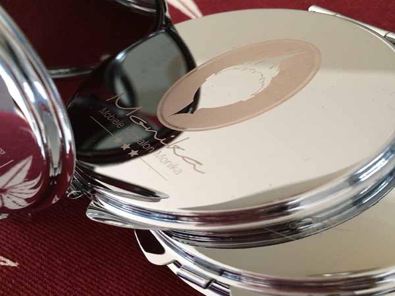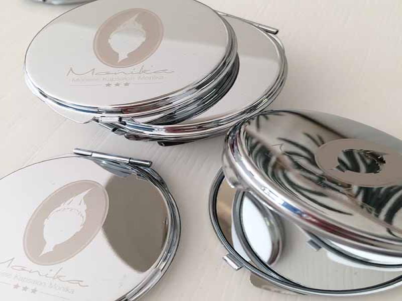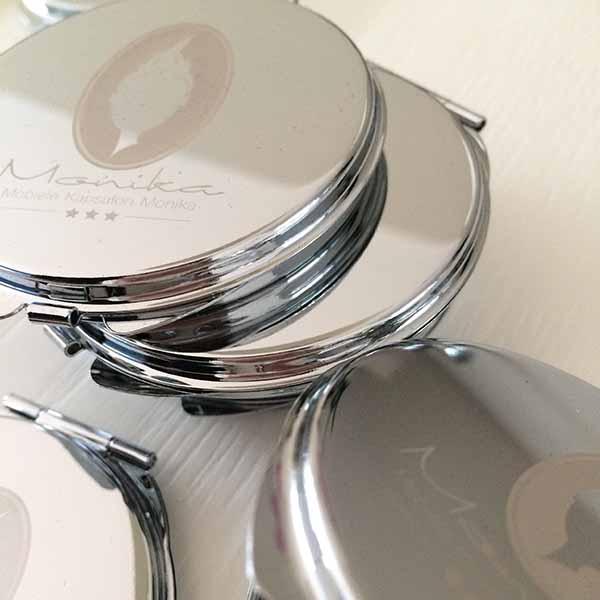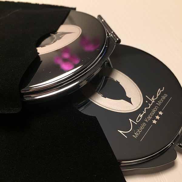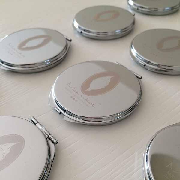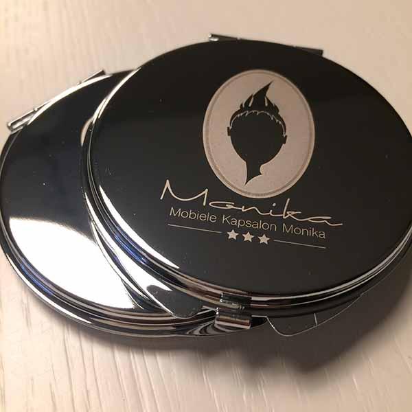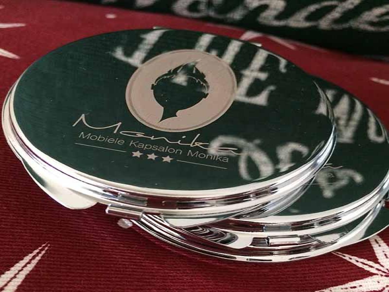 De meeste opdrachtgevers van Studio Hey zijn inmiddels begonnen met de voorbereidingen en momenteel zijn we dus druk doende met het ontwerpen en klaarmaken van diverse items als kerstkaarten, kalenders etc. Sommige klanten waren er dit jaar heel vroeg bij en zijn net na de zomervakantie al begonnen, waaronder Mobiele Kapsalon Monika. De eigenaresse wilde graag een geschenkje dat past bij haar dienstverlening en dat haar klanten langere tijd kunnen gebruiken. We hebben gekozen voor zakspiegeltjes met het bedrijfslogo erin gegraveerd. Deze zijn inmiddels al binnen en erg leuk geworden (al zeg ik het zelf ;-)). Ik vond ze zo leuk geworden dat ik er gelijk maar even een kleine product fotoshoot van gemaakt heb. Hieronder zie je er een paar uit deze sessie. De eigenaresse van Mobiele Kapsalon Monika is zelfs al begonnen met het uitdelen ervan, want ze vond de spiegeltjes zo mooi dat ze niet langer kon wachten om haar klanten ermee te verrassen.