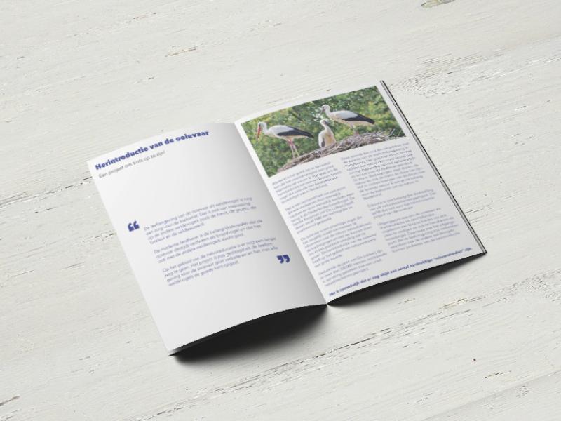 Om de bevindingen van deze werkstukken te kunnen presenteren en nader toe te lichten is door Studio Hey in opdracht van Adviespraktijk voor Vogels en Ooievaarsbuitenstation de Lokkerij een brochure ontwikkelt. Deze brochure is uitgevoerd op A5 formaat, de cover is gedrukt op 250 grs. glanzend papier en het binnenwerk is gedrukt op 135 grs. glanzend papier. In de brochure zijn d.m.v. QR-codes links gelegd naar de website van de Adviespraktijk voor Vogels en Ooievaarsbuitenstation de Lokkerij om de lezer zo eenvoudig door te verwijzen naar meer achtergrondinformatie online.